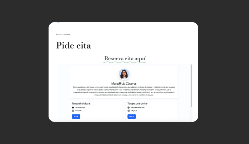 Desarrollo de una página web profesional para consulta de psicología. Incluye información sobre servicios terapéuticos, sistema de citas online, blog con artículos de salud mental y formulario de contacto seguro para pacientes.
